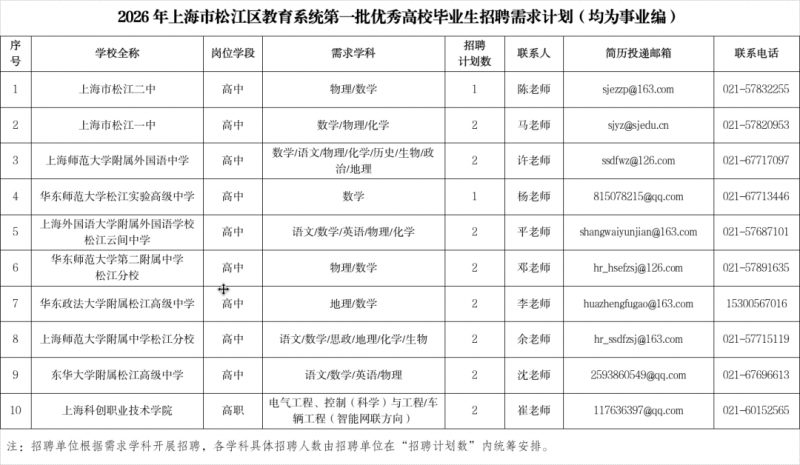 附表:2026年上海市松江区教育系统第一批优秀高校毕业生招聘需求计划
