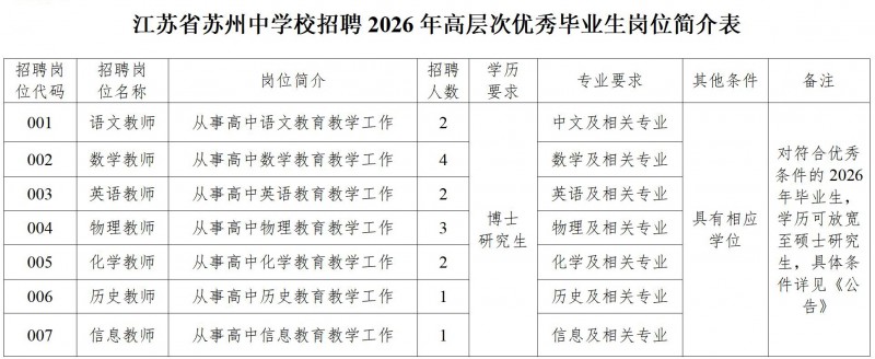 招聘岗位及条件等详见《江苏省苏州中学校招聘2026年高层次优秀毕业生岗位简介表》(附件1),可在江苏省苏州中学校官网(http://www.szzx1000.cn)、苏州市教育局网站(http://jyj.suzhou.gov.cn)及苏州市人力资源和社会保障网(http://hrss.suzhou.gov.cn)上查询。