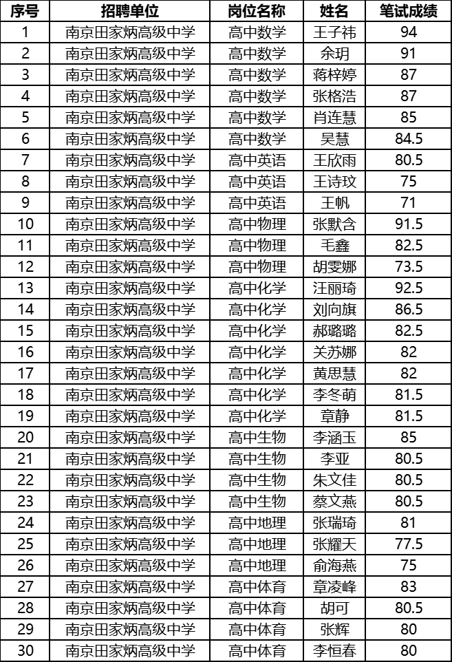 根据《南京市教育系统部分事业单位2025年11月公开招聘教师公告》(宁事招公告(R)〔2025〕22号)要求,经资格审查,现将南京田家炳高级中学2025年11月公开招聘进入面试人员名单公示,其他具体要求见《面试通知单》。请相关人员按照要求,做好面试准备。