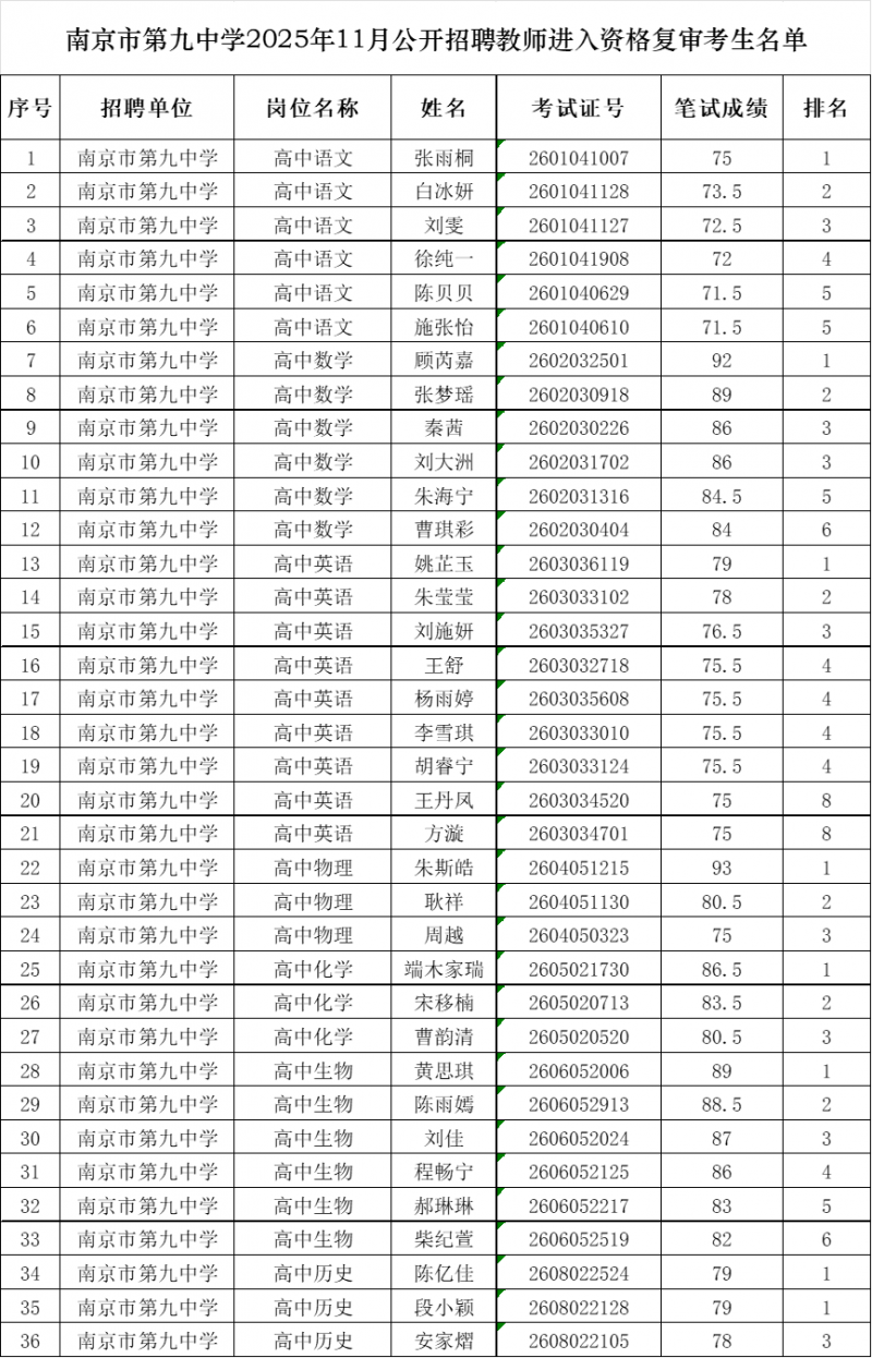 《南京市第九中学2025年11月公开招聘教师进入资格复审考生名单》(附后)