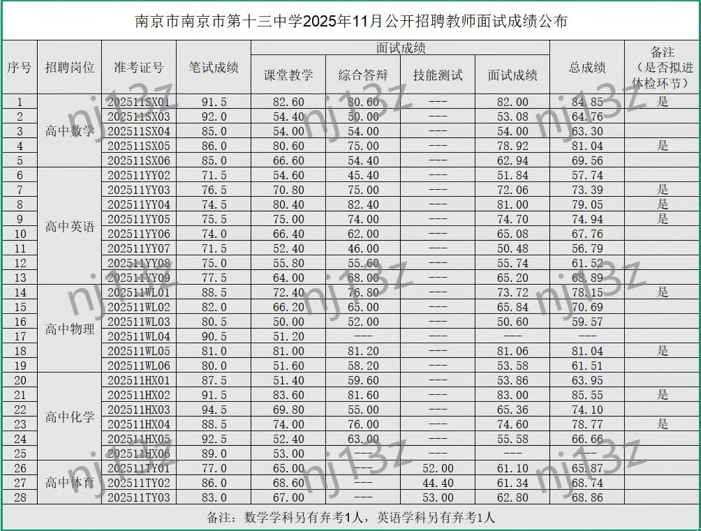 根据《南京市教育系统部分事业单位2025年11月公开招聘教师公告》(宁事招公告(R)〔2025〕22号)要求,南京市第十三中学已于2025年12月13日、2025年12月23日完成了笔试、面试工作,现将面试成绩予以公布。